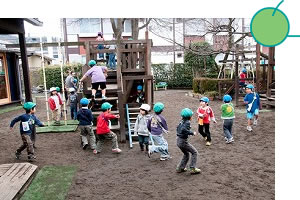 | 年少のクラスに自分たちのウッドデッキがついています。庭で遊んでいる姿を見ながら、自分たちの遊びができます |