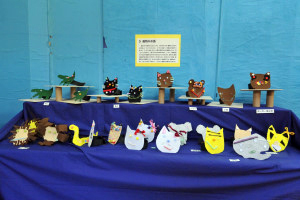 廊下から保育室へレールが敷かれ 「でんしゃごっこ」を軸とした展示がされています。 動物のお面、カメラやパンなど遊びの中で作られたものばかりです。(年少組) |