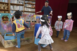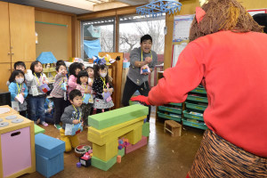 「おにさん たからばこ どうぞ」とプレゼント作戦に出た年少組の子どもたち。 |