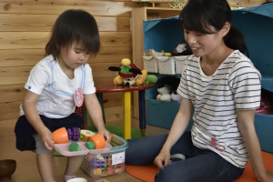 お母さんの側で安心してままごと遊びを始めました。 |