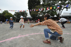 年少さんたちが、担任の先生の腕の中を目指して走ります。 |