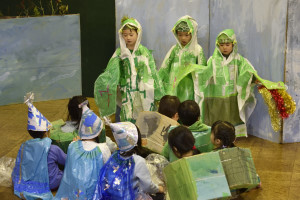 みんなでそろって終わりの挨拶をしました。なお、同じ劇をはと組のもうひとつのグループも演じました。セリフなども違うところもあり、ライブ感覚たっぷりでした。 |