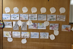 そのかなこを題材にして劇を作ろうとみんなで考え、それを絵にしてストーリーを作っていきました。そして、そこで話し合われたことを吹き出しのようにして保育者が書き留めていきました。 |
