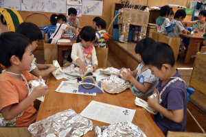 セロテープでとめながらみんなで模型を組み上げる。 |