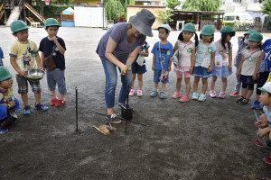 「電車の庭」は踏み固められているので、先生が金槌で強くたたいて特注のY型の棒を打ち込みました。 |