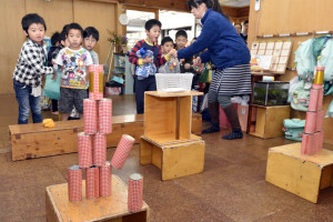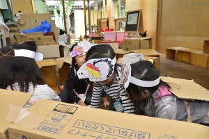 毎朝、年中、年少組は段ボールで作った家をみんなで運び出します。 |