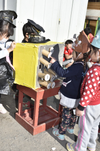 年少組から年長組まですべての制作物が運び出され、電車の庭に「まち」が出現しました。 |