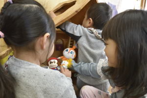 今日は「ひよこ組お楽しみ会」がありました。節分の鬼が間もなく現れるのでほんの少し免疫を付けておこうという企画です。(年少組) |