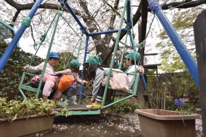 「はこブランコ」です。みんなで調子を合わせてこぐことが身につく遊具なのですが、危険だというので公園や多くの園庭から姿を消しました。 |