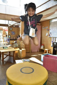 こちらは年中組の保育室内に置かれた跳び箱からのジャンプです。 |
