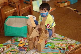 | イチョウの庭、はくちょう組の隣の庭で、お家ごっこです。 | ブロックで何を作っているのかな? |