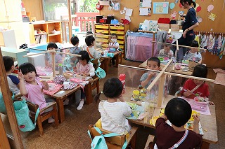 | 自分でお弁当の準備をして、食べています。 | コロナウイルスの感染予防に、透明の仕切りをしています。 |