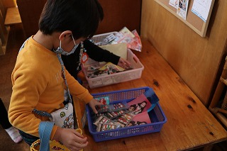 | 景品を選んでいます。 | ジャンケン屋さんです。保育者とジャンケンをします。 |