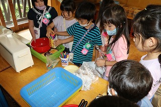 | カエルが元気にジャンプしたところです。 | ひよこ4組さんは、自分の好きなジュースを作っています。 | ![]() |