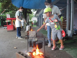 | ご飯を炊いています。「ぐつぐつ」感触が伝わったかな? | 暑くて煙いご飯係りでした。 |