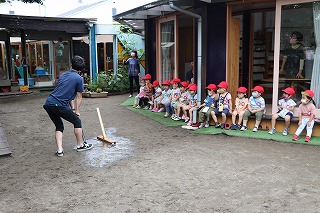 | 砂場で、水遊びが始まりました。 |