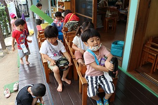| 椅子を使って座る時もあれば、丸くなってそのまま集まることもできま す。 | トイレに行く前に、クルットまわってから言っています。 |
