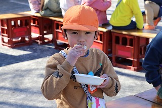 | 年長組さん、豪快に食べています。 |