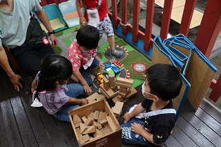 積木を使い、遊び始めました。お互いのイメージをつないでいるのでしょう。 |