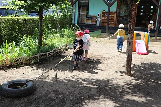 | ひよこに庭での料理作りです。(三歳児) |