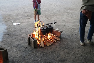 | 早速飯盒を炊く場所で火に飯盒をかけました。 |