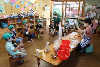 年長さんの盛り付けは先生がおこなっています。 |