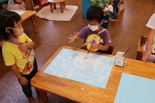 | 色水ができたよと、見せに来てくれました。 |